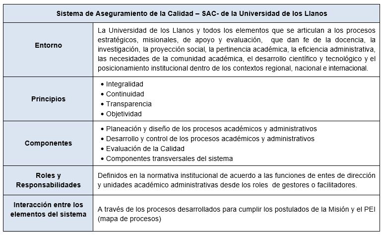 La Universidad de los Llanos cuenta con una política de calidad establecida mediante el Sistema de Gestión de Calidad, la cual ha sido actualizada atendiendo a las dinámicas que se vienen dando, entre ellas el establecimiento del Sistema de Aseguramiento de la Calidad -SAC- de la Universidad de los Llanos, en el cual se articulan conceptual y operacionalmente los elementos que son indispensables para asegurar la calidad en el desarrollo de las funciones misionales atendiendo a las disposiciones reglamentarias, normativas, así como a las necesidades de la sociedad y exigencias del Estado.